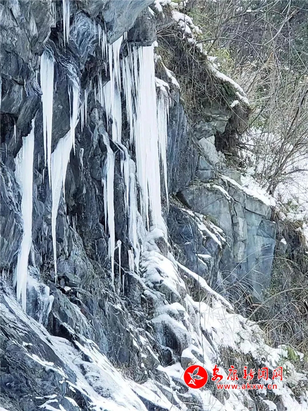 愈往深山走去,愈是銀裝素裹。發(fā)如雪,天作襯。色彩在這里失去了顏色,整個世界只剩下黑與白的構圖。山澗中露出的黑巖,連綿著,將青絲的線條起伏蜿蜒地勾勒而出。山腳下一排排整齊的村民安置房,已顯出冬眠酣睡的樣子。樹林里帶著一層朦朧,在群山連綿中起伏著,為這雪天獻上了一幅絕美的水墨畫卷,也更增加了幾分神秘。