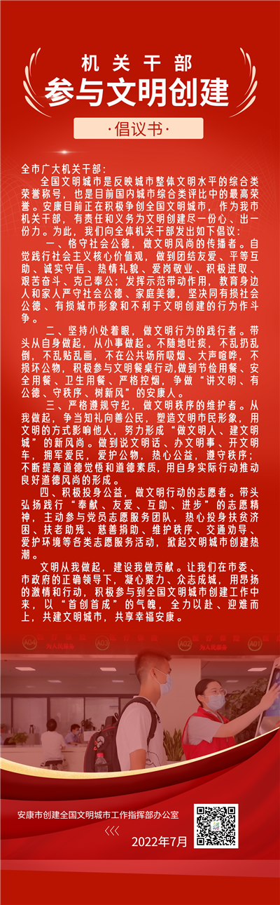 全國(guó)文明城市是反映城市整體文明水平的綜合類(lèi)榮譽(yù)稱(chēng)號(hào),也是目前國(guó)內(nèi)城市綜合類(lèi)評(píng)比中的最高榮譽(yù)。安康目前正在積極爭(zhēng)創(chuàng)全國(guó)文明城市,作為我市機(jī)關(guān)干部,有責(zé)任和義務(wù)為文明創(chuàng)建盡一份心、出一份力。為此,我們向全體機(jī)關(guān)干部發(fā)出如下倡議: