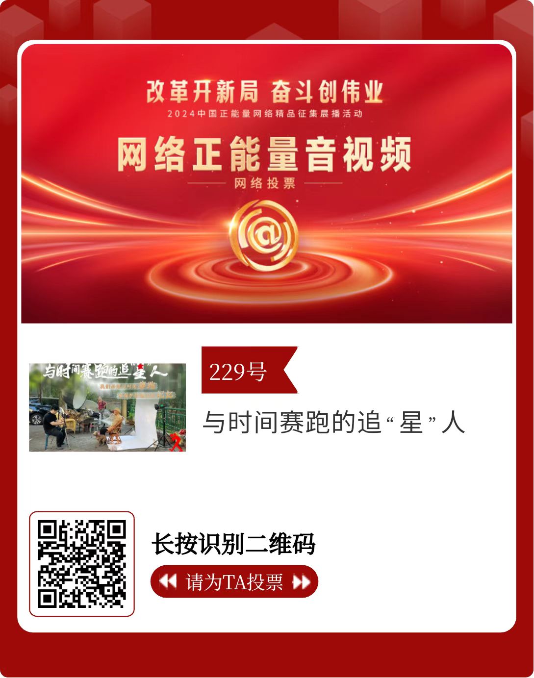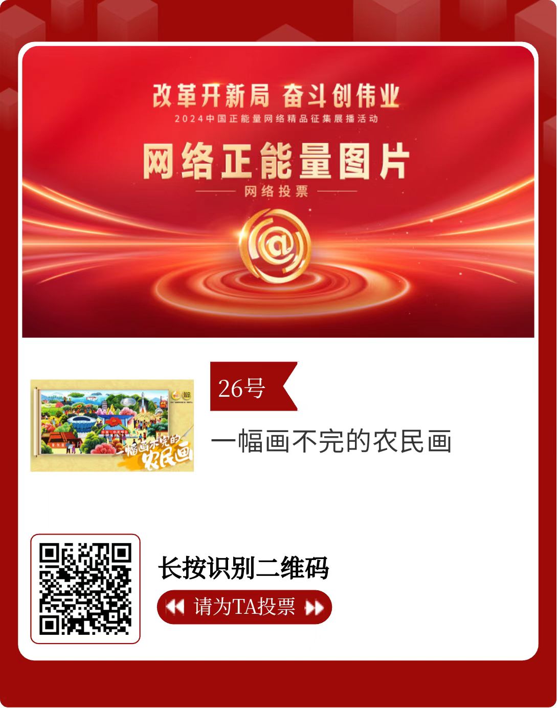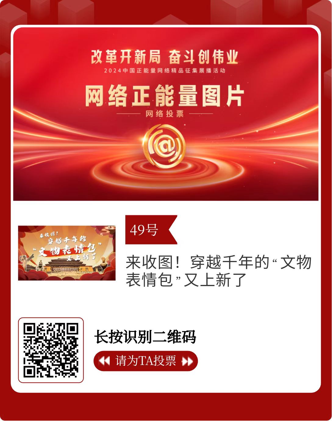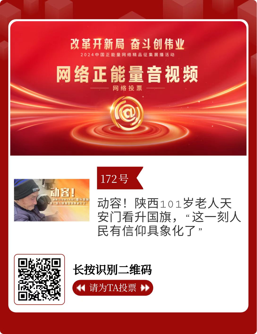 改革開新局,奮斗創(chuàng)偉業(yè)。由中央網(wǎng)信辦主辦的2024中國正能量網(wǎng)絡(luò)精品征集展播活動(dòng)今天啟動(dòng)網(wǎng)絡(luò)展播投票。