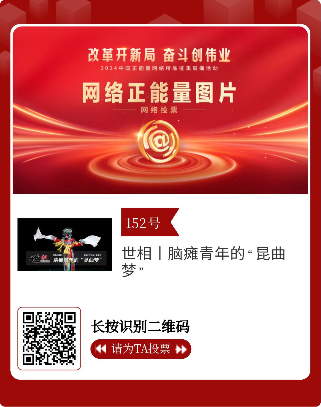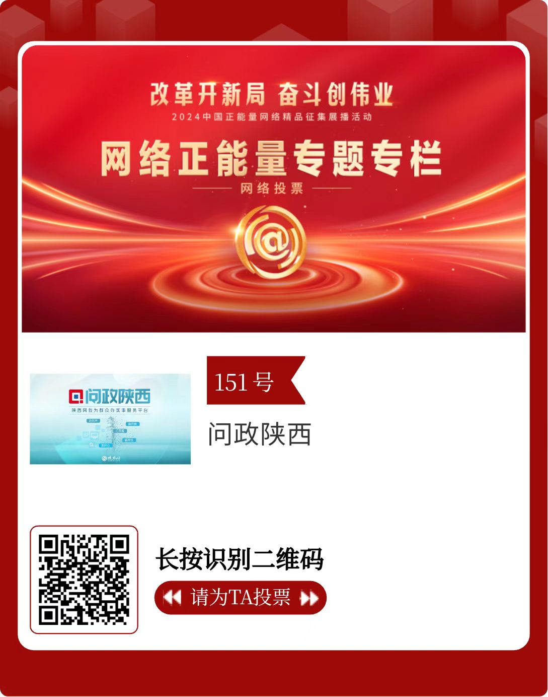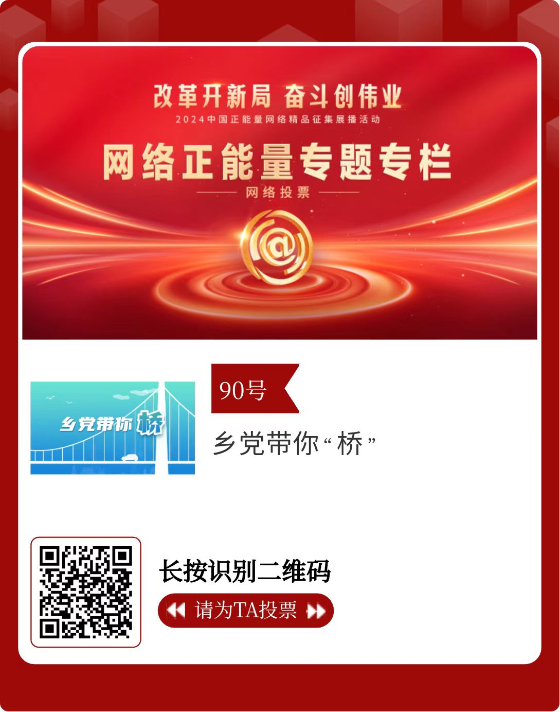 改革開新局,奮斗創(chuàng)偉業(yè)。由中央網(wǎng)信辦主辦的2024中國正能量網(wǎng)絡(luò)精品征集展播活動(dòng)今天啟動(dòng)網(wǎng)絡(luò)展播投票。