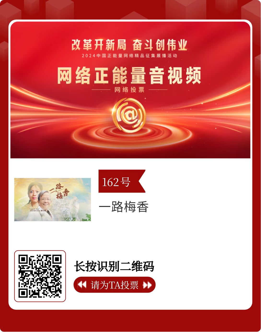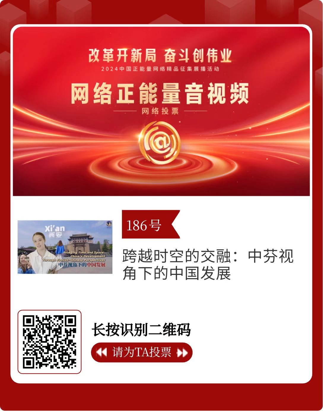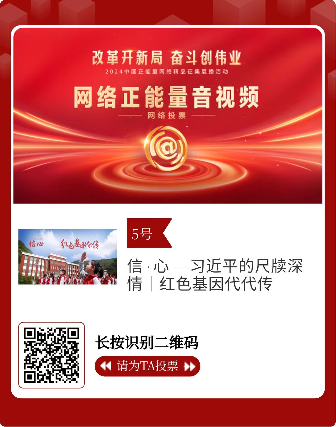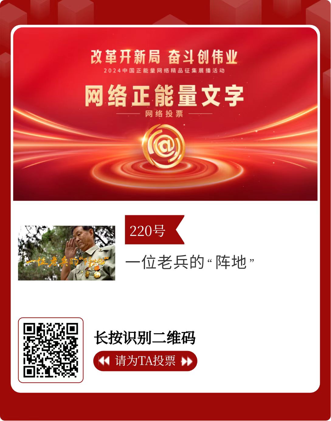 改革開新局,奮斗創(chuàng)偉業(yè)。由中央網(wǎng)信辦主辦的2024中國正能量網(wǎng)絡(luò)精品征集展播活動(dòng)今天啟動(dòng)網(wǎng)絡(luò)展播投票。