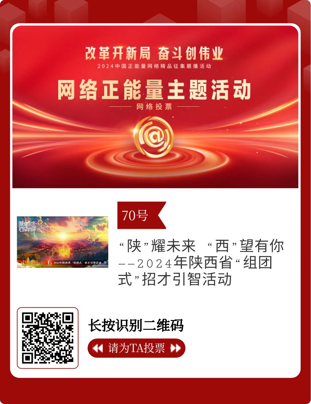 陜西省32件作品進(jìn)入投票環(huán)節(jié),投票時(shí)間為2月15日至2月21日,投票結(jié)果將作為中國正能量網(wǎng)絡(luò)精品遴選的重要參考。中國正能量網(wǎng)絡(luò)精品,期待每一個(gè)充滿正能量的你投出點(diǎn)贊一票。