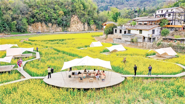 陽(yáng)春三月,秦嶺腳下,春風(fēng)彌漫,油菜花開得正旺,朱鹮掠過(guò)古村青瓦。白墻黛瓦的民宿群中,咖啡濃香與油菜花香交織,令游人流連忘返,返鄉(xiāng)青年正在直播推介農(nóng)貨……