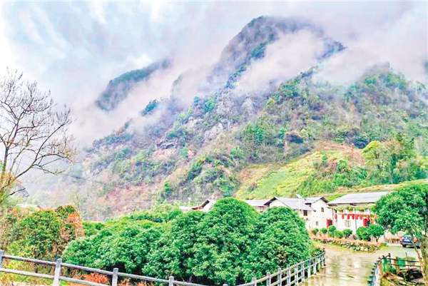 推開房門,晨霧尚未散盡,細(xì)雨斜斜地織著。老人們常說(shuō)“有雨山戴帽,無(wú)雨半山腰”,這話在此時(shí)格外應(yīng)景——裊裊云霧沉甸甸地壓住遠(yuǎn)處的峰頂,像給每座山頭都戴了一頂灰絨帽子,讓群山失去了往日的險(xiǎn)峻,只留下青灰色的輪廓,恍若一幅優(yōu)美的寫意水墨畫。等到午后雨勢(shì)稍小,云霧退到半山腰,卻始終戀著大山不肯消散。隨著一陣陣微風(fēng)拂起,那些云霧像被吹落的玉帶,在墨綠的樹林間織出半透明的簾幕。