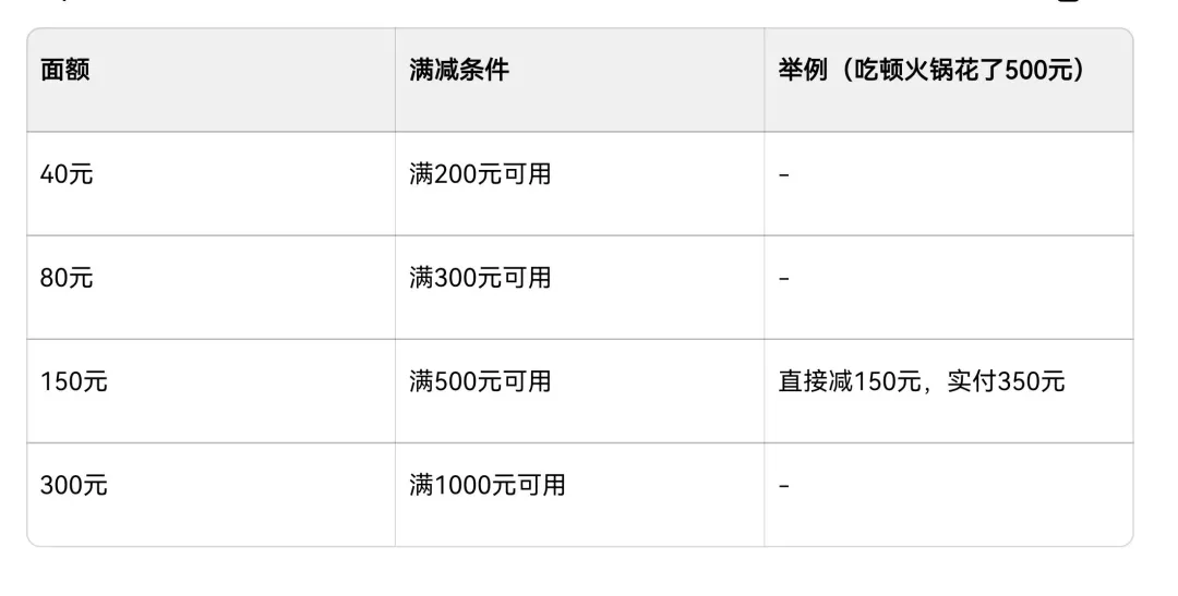 300元面額,餐飲消費(fèi)滿1000元每次抵用一張。