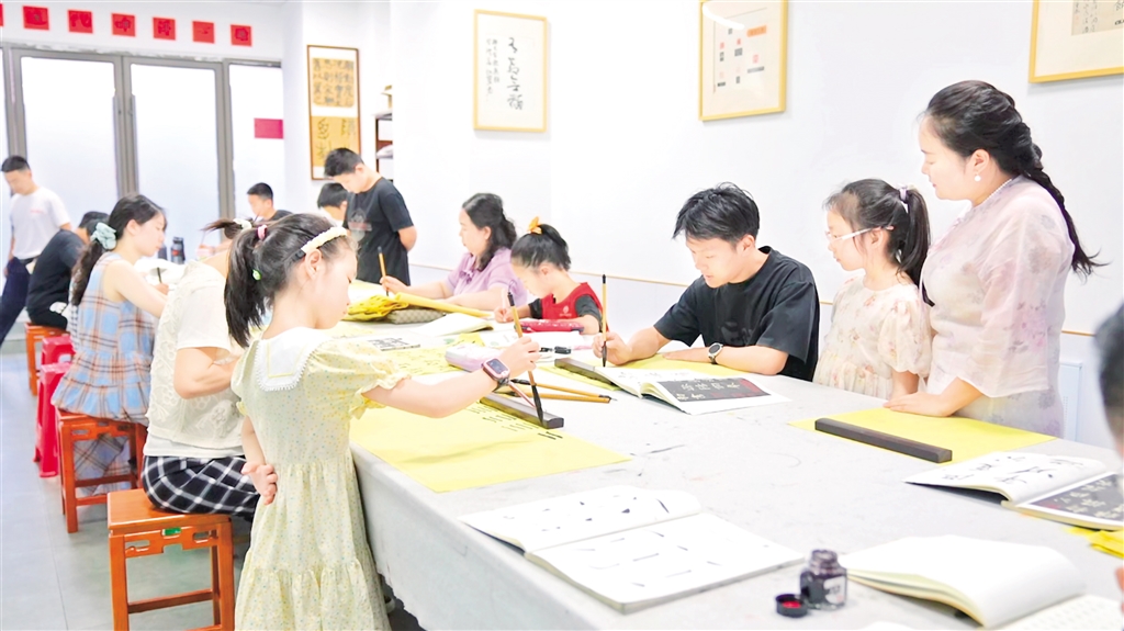 “我們來看下這‘?!?,是左右結(jié)構(gòu)的字,左邊的偏旁是一個三點水,三點水寫的時候要注意連貫性……”書法老師細(xì)致地拆解著漢字的書寫技巧,耐心指導(dǎo)著現(xiàn)場的每一位學(xué)員。