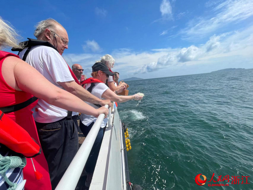 2024年6月,浙江舟山東極島附近海域的一艘船上,75歲的丹妮絲·維尼和同船的人們一道,將手里的白色花瓣撒向大海。