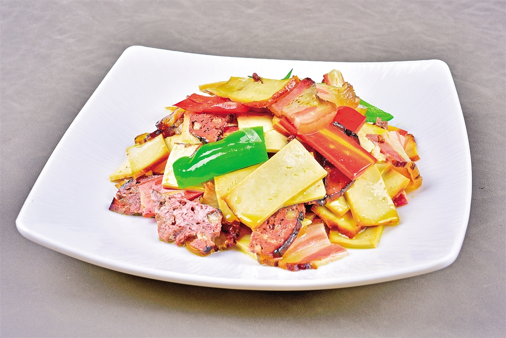血豆腐干的制作工藝頗為講究,需經(jīng)過多道工序方能成就其獨特風味。人們會選用當?shù)禺a(chǎn)的優(yōu)質(zhì)黃豆,制成鮮豆腐后捏碎,加入精選的豬肉餡料,比例要恰到好處,肉太多則膩,太少則失其鮮。新鮮豬血是關(guān)鍵,必須在短時間內(nèi)與豆腐混合,才能保證其色澤鮮艷。熏制好的血豆腐干,外黑內(nèi)紅,用手輕輕捏起,有微微的彈性,此時的口感最佳。若熏制過度,就會變得干硬如鐵,失去原本的風味。食用時,切成薄片涼拌,淋上香油、醋和蒜末,入口先是豆香,繼而肉香四溢,最后留下一絲煙熏的余味?;蛘吲c臘肉、豆腐干、青紅辣椒同炒,便是漢陰各個餐館都有的“雙干炒臘肉”,這種層次分明的口感,吃到口中便齒頰生香,令人回味無窮。
