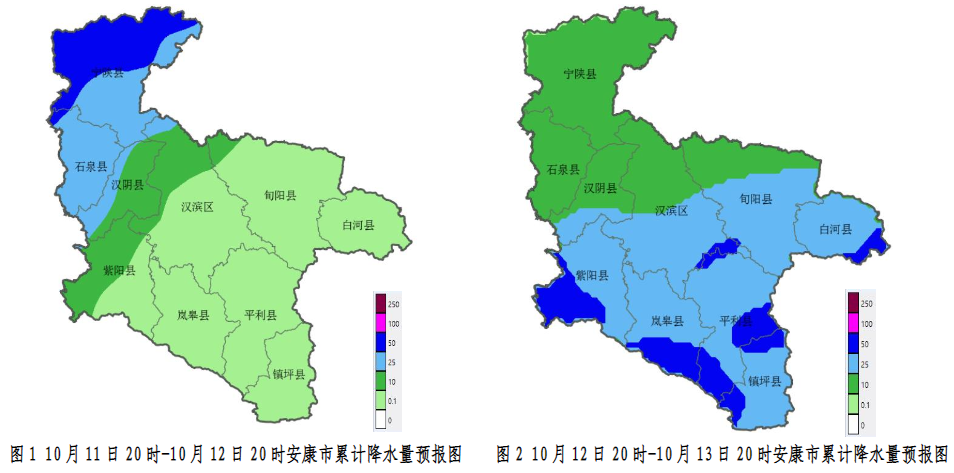 10月12日:全市大部陰天轉(zhuǎn)大雨(25~45毫米),紫陽大部、嵐皋南部、平利中南部、鎮(zhèn)坪、漢濱南部、白河局地有暴雨(超過50毫米),過程期間局地伴有雨強(qiáng)超過10毫米/小時的強(qiáng)降水;