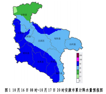 10月16日:陰天轉大雨,寧陜、石泉、漢陰、紫陽、嵐皋、漢濱北部、旬陽北部局地暴雨(25~60毫米,局地可達70毫米以上);