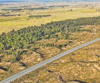 “十四五”時(shí)期,“三北”工程攻堅(jiān)戰(zhàn)取得階段性成效。圖為內(nèi)蒙古庫布其沙漠北緣鎖邊林帶。新華社記者 李志鵬攝