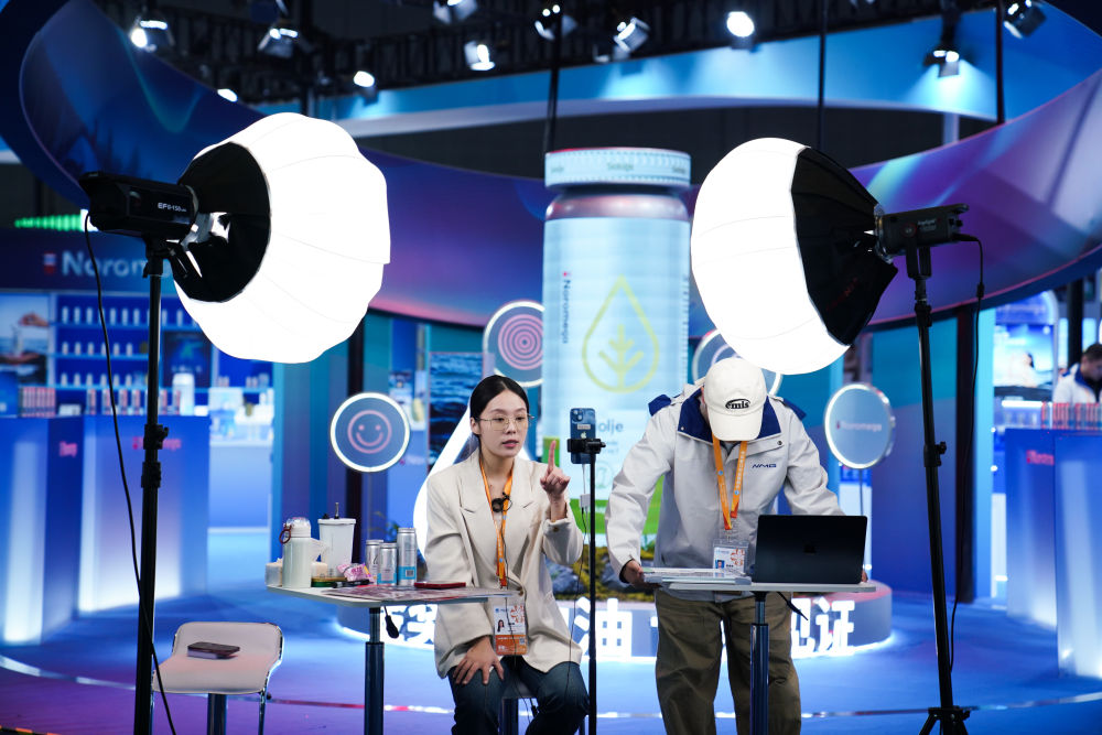 2025年11月4日,工作人員在第八屆進博會醫(yī)療器械及醫(yī)藥保健展區(qū)直播。本屆進博會直播密度大、形式多樣,有的展位專門搭建直播區(qū)域,燈光、背景、展板一應(yīng)俱全;有的展位手機一架、產(chǎn)品一擺,直播就地開始;還有的直播間是“流動的”,達人主播們拿著手機、別著麥克風,穿梭于各個品牌展位間現(xiàn)場推薦……八年來,進博會影響力逐年遞增,越來越多的中國消費者愿意通過直播了解進博會上的“全球好物”。