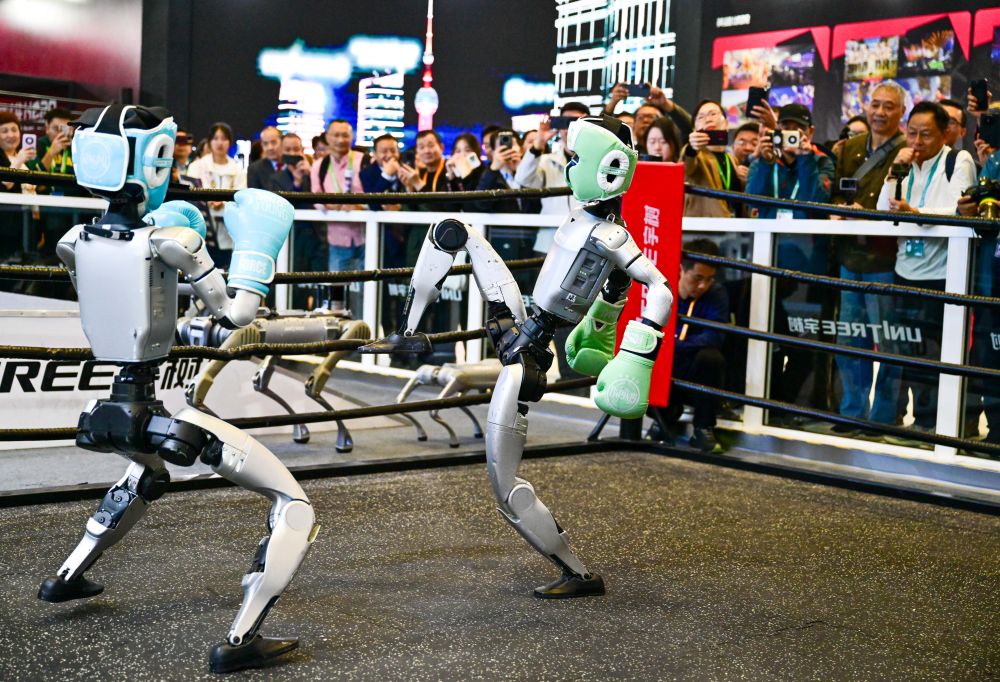2025年11月6日,人形機器人在第八屆進博會宇樹科技展臺進行格斗表演。當日,在技術(shù)裝備展區(qū)宇樹科技展臺,兩臺G1人形機器人的格斗表演吸引了眾多觀眾。它們戴著護具及拳套,施展直拳、勾拳、左右鞭腿,展示倒地自主起身等復(fù)雜動作,不時贏得觀眾喝彩。