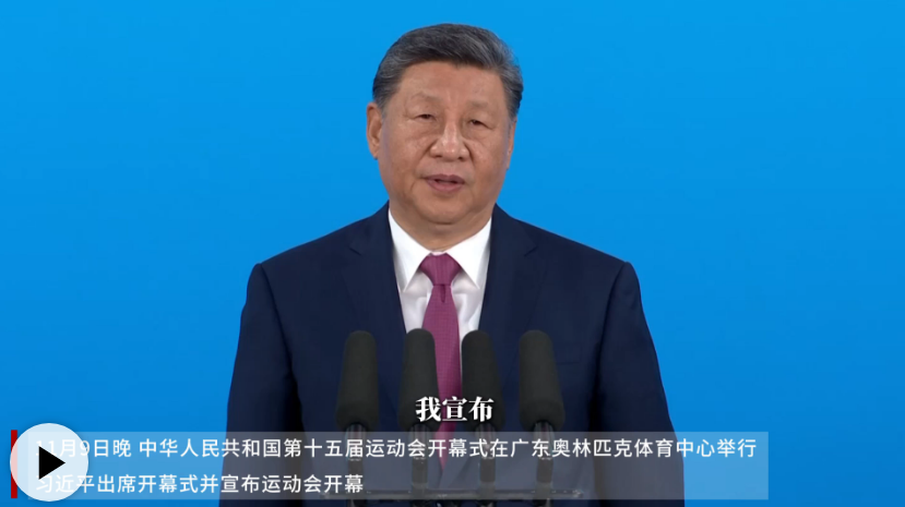 11月9日晚,中華人民共和國(guó)第十五屆運(yùn)動(dòng)會(huì)在廣東省廣州市隆重開(kāi)幕。中共中央總書(shū)記、國(guó)家主席、中央軍委主席習(xí)近平出席開(kāi)幕式并宣布運(yùn)動(dòng)會(huì)開(kāi)幕。