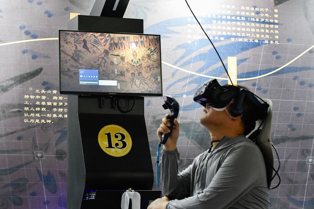 ??2024年7月22日,一名游客在敦煌莫高窟“尋境敦煌——數(shù)字敦煌沉浸展”上借助VR設(shè)備沉浸式游覽莫高窟第285窟虛擬場景?!皩ぞ扯鼗汀本C合運用了VR虛擬現(xiàn)實、三維建模、游戲引擎的物理渲染和全局動態(tài)光照等新技術(shù),高精度立體還原了莫高窟第285窟。游客戴上VR眼鏡,不僅可以零距離觀賞壁畫、360度自由探索洞窟細(xì)節(jié),還能“飛升”到窟頂,身臨其境參與壁畫故事情節(jié),沉浸式感受敦煌文化的魅力。
