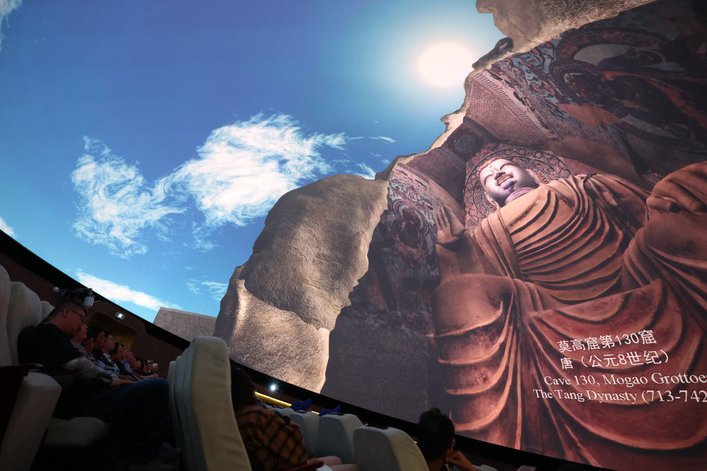 ??2024年9月4日,游客在敦煌莫高窟數(shù)字展示中心觀看球幕電影《夢幻佛宮》。