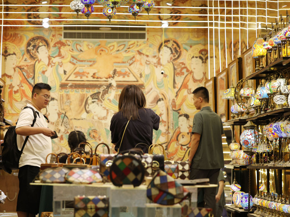 ??2025年6月26日,游客在敦煌夜市選購文創(chuàng)產(chǎn)品。今年以來,敦煌市全面改造敦煌夜市等特色街區(qū),圍繞敦煌深厚的歷史文化底蘊,融入壁畫、絲路文化等元素,通過布設(shè)文化景觀小品、打造沉浸式餐飲體驗空間、上線特色文創(chuàng)產(chǎn)品等方式,給游客帶來多元體驗,“夜經(jīng)濟(jì)”持續(xù)升溫,不斷釋放文旅消費潛力。