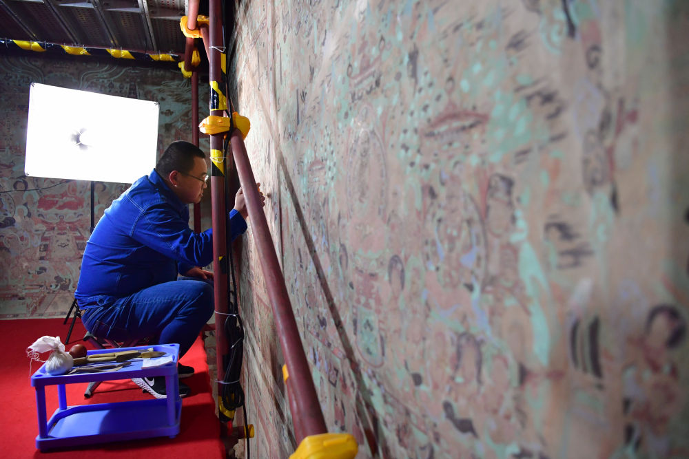??2022年4月19日,敦煌研究院文物保護(hù)技術(shù)服務(wù)中心的壁畫修復(fù)師楊金禮在莫高窟第231窟內(nèi)修復(fù)壁畫。