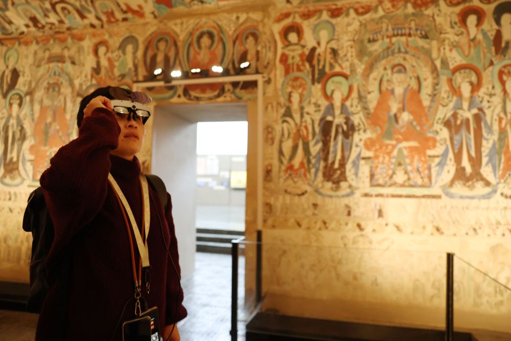 ??2025年10月30日,在敦煌石窟文物保護(hù)研究陳列中心,游客使用AR設(shè)備在復(fù)制洞窟參觀體驗。