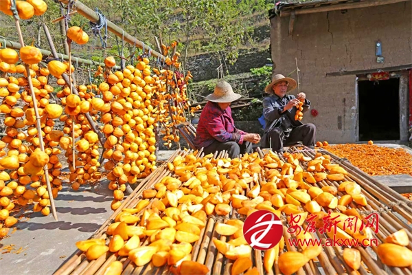 鄉(xiāng)親們趁著柿子還沒軟就采摘下來,在房前屋后搭起一排排晾曬柿餅的木架,開始每年一次的傳統(tǒng)手工勞作:去皮、懸掛、晾曬。出霜后就成了美味的柿餅。