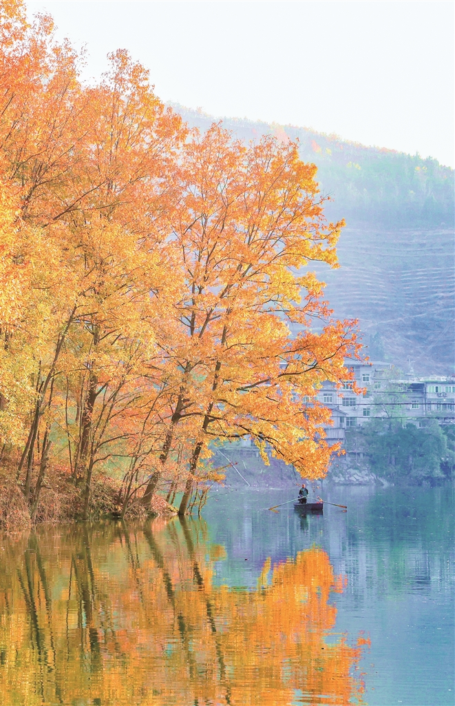 待到霧散天青,沙坪河便展露出它清澈的容顏。兩岸層林盡染,漫山的斑斕都被河水溫柔收納。一川碧水如鏡,完整復(fù)刻出天空與彩林的倒影,虛實(shí)交錯,舟行其上,仿佛滑入一幅靜止的油畫。山偎著水,水映著山,靜謐而又絢爛。?