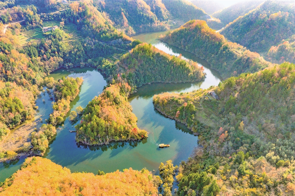夕陽下的沙坪河,斑斕山林與澄澈水色繪就成一幅靈動的水鄉(xiāng)畫卷。郭浩 攝