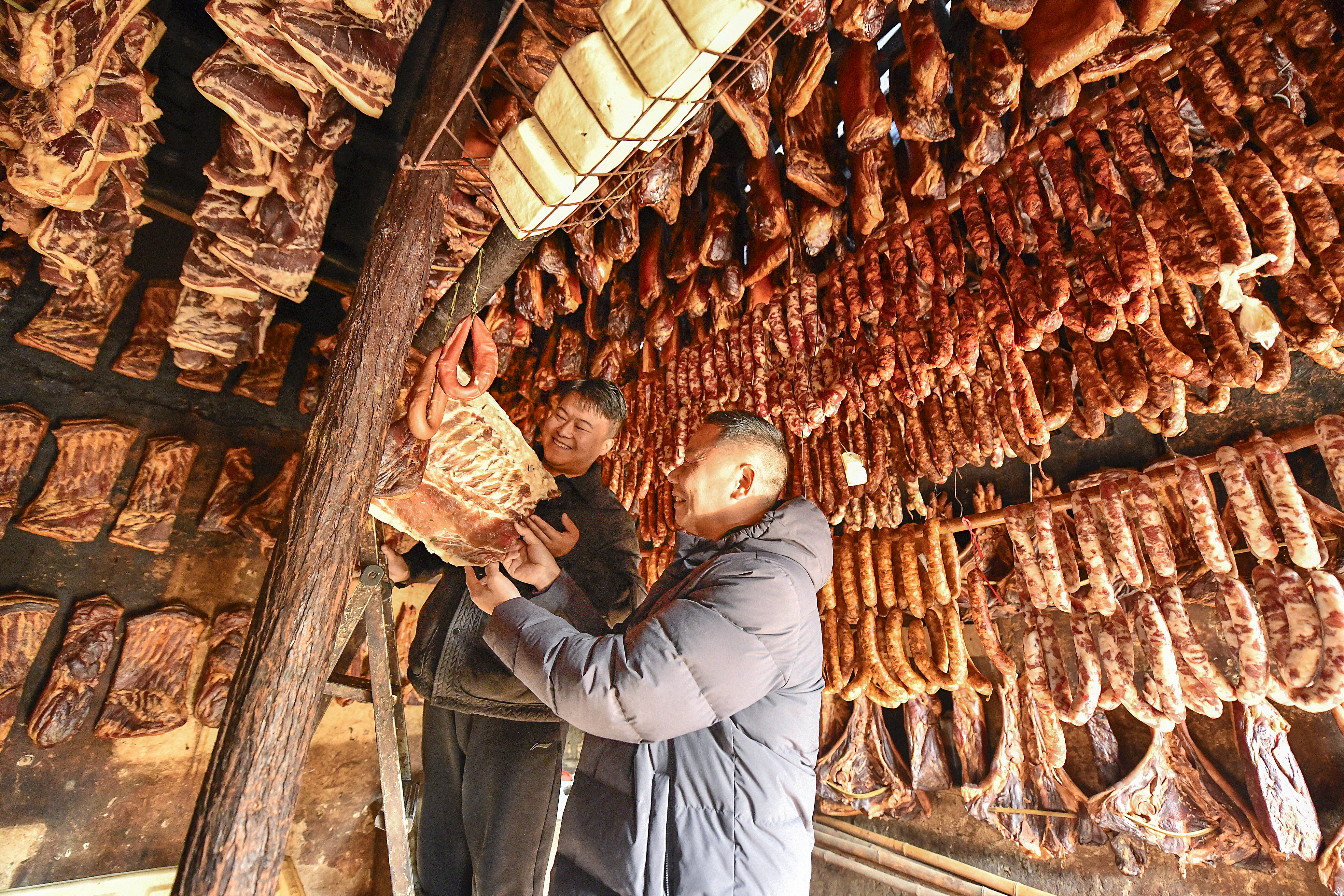 12月29日,走進石泉縣城關鎮(zhèn)珍珠河村王全勇家,臘肉、香腸整齊懸掛,紅亮油潤。近年來,珍珠河村以集體經(jīng)濟合作社牽頭,發(fā)動返鄉(xiāng)能人,在安全前提下,以古法烘制臘肉、香腸等特色“年貨”,年均出產臘肉6萬余斤,持續(xù)做強本土“臘味”經(jīng)濟,多渠道助農增收。