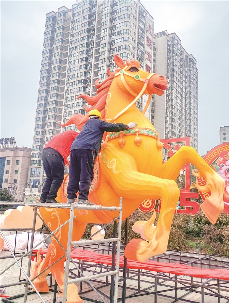 春節(jié)臨近,石泉縣依托獨特漢水文化、蠶桑文化、移民文化資源稟賦,通過設置漢江神女、蠶桑娘娘、嫦娥奔月、漢調(diào)二黃等造型獨特的燈飾,營造濃濃的新年氛圍。圖為1月17日下午,工人正在安裝燈飾。(譚文昌 攝)