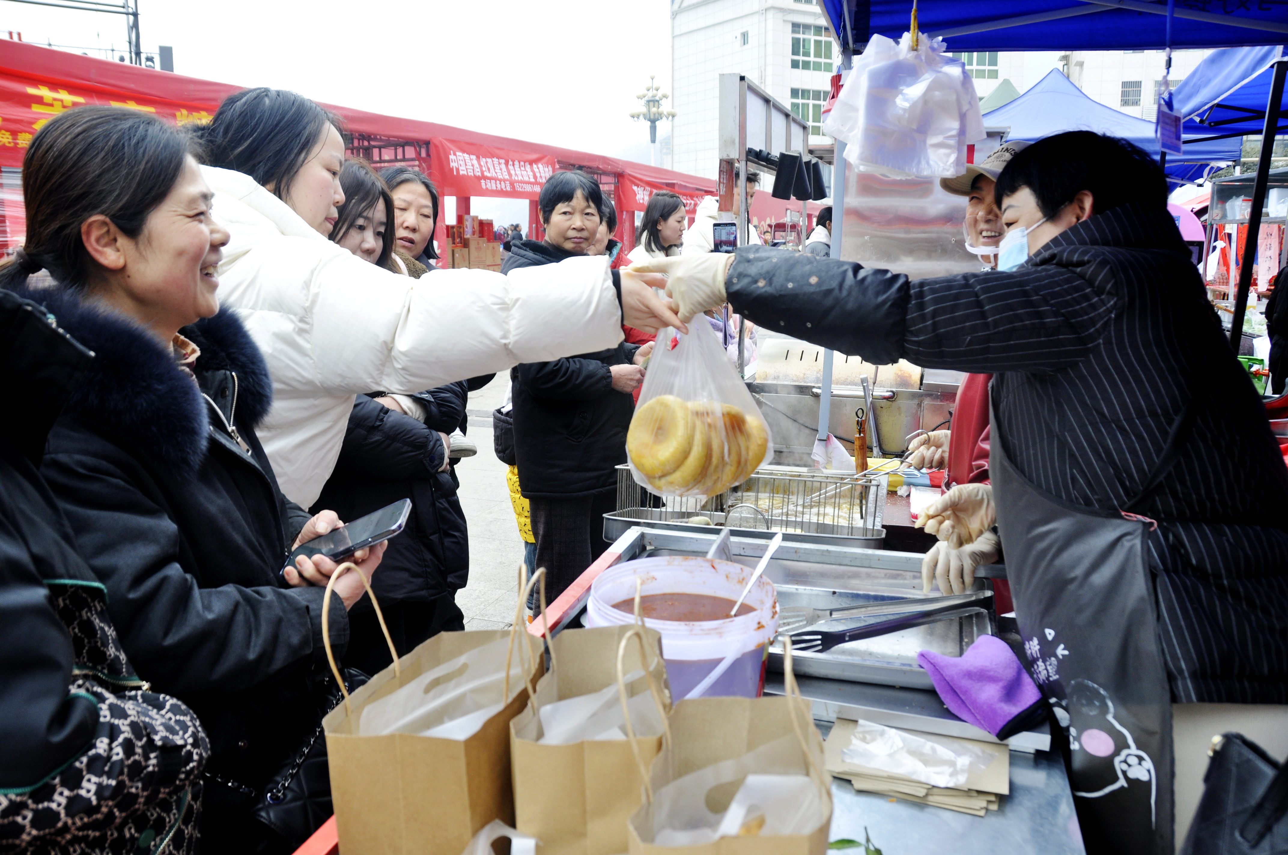 節(jié)日里的紫陽縣城一派繁榮祥和,圖為市民在頗有名氣的煥古高老二的油糍攤前排隊(duì)購買。彭召伍 攝