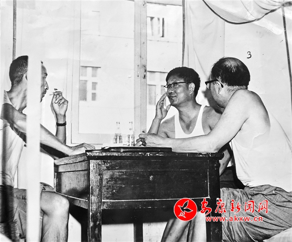 1983年8月中旬,安康日報社社長張成彬(右,已病逝)與陜西日報社高級記者元樹德(中)、張運德在互通新聞信息。