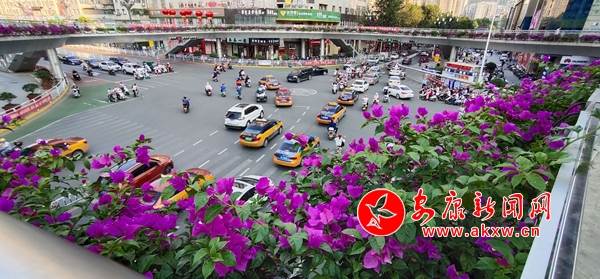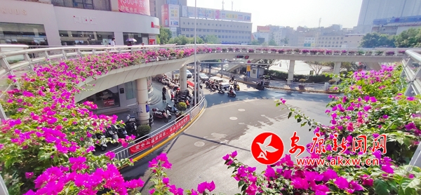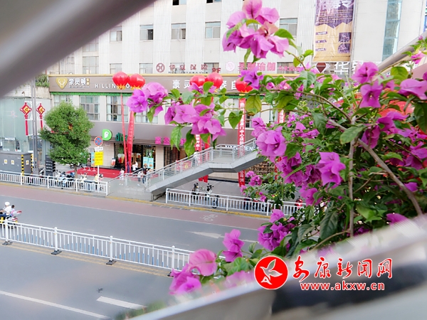 本網(wǎng)訊 (記者 艾蓓)日前,記者途徑安康城區(qū)各大人行天橋時發(fā)現(xiàn),一抹鮮艷的色彩映入眼簾,遠(yuǎn)遠(yuǎn)地就看到一簇簇三角梅沿著天橋欄桿一字排開,玫紅色的花朵在綠葉的映襯下更顯絢麗。原本“呆板乏味”的人行天橋在鮮花的裝扮下,變得姿態(tài)萬千,生氣十足,人在橋上行走,仿佛在花廊中穿行,讓人心曠神怡。