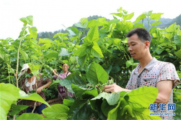 饒峰鎮(zhèn)新華村的養(yǎng)蠶戶邱紅軍(右)在自家的桑樹(shù)園內(nèi)采摘桑葉(9月6日攝)。