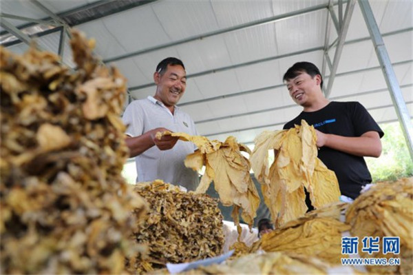 饒峰鎮(zhèn)齊心村永根雙帶種植專業(yè)合作社理事長(zhǎng)華永根(左)和一名鎮(zhèn)干部在查看分揀好的煙葉(9月5日攝)。