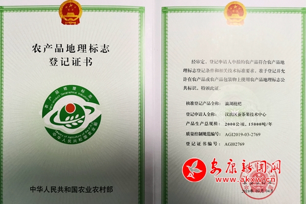 日前,農(nóng)業(yè)農(nóng)村部發(fā)布公告,漢濱區(qū)農(nóng)業(yè)農(nóng)村局蠶茶果技術(shù)中心申報的“瀛湖枇杷”經(jīng)過初審、專家評審和公示,符合農(nóng)產(chǎn)品地理標(biāo)志登記條件和相關(guān)技術(shù)標(biāo)準(zhǔn)要求,準(zhǔn)予登記,特頒發(fā)中華人民共和國農(nóng)產(chǎn)品地理標(biāo)志登記證書。