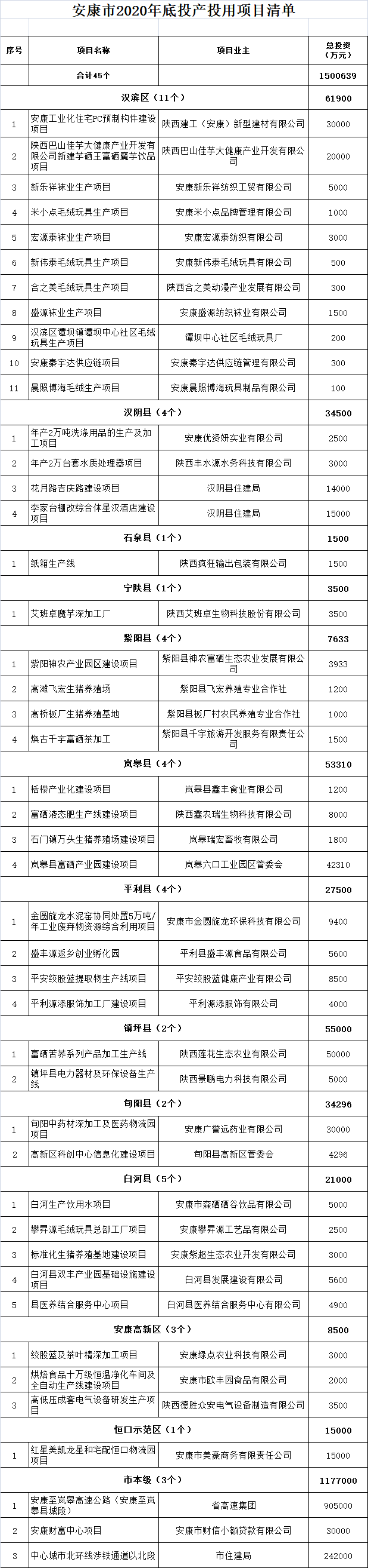 安康市2020年底集中投產(chǎn)投用重點(diǎn)項(xiàng)目清單