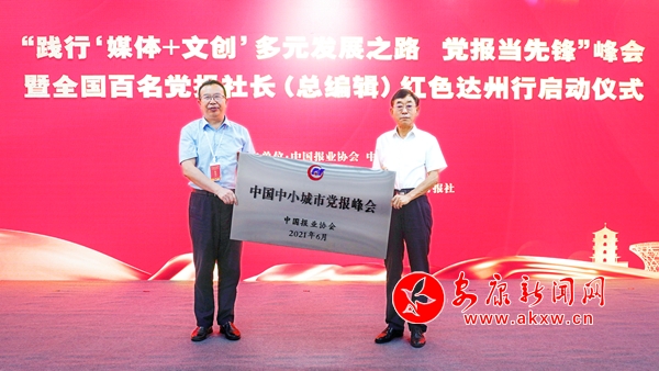 啟動(dòng)儀式上,中國(guó)報(bào)業(yè)協(xié)會(huì)為達(dá)州日?qǐng)?bào)社授予“中國(guó)中小城市黨報(bào)峰會(huì)”匾牌。