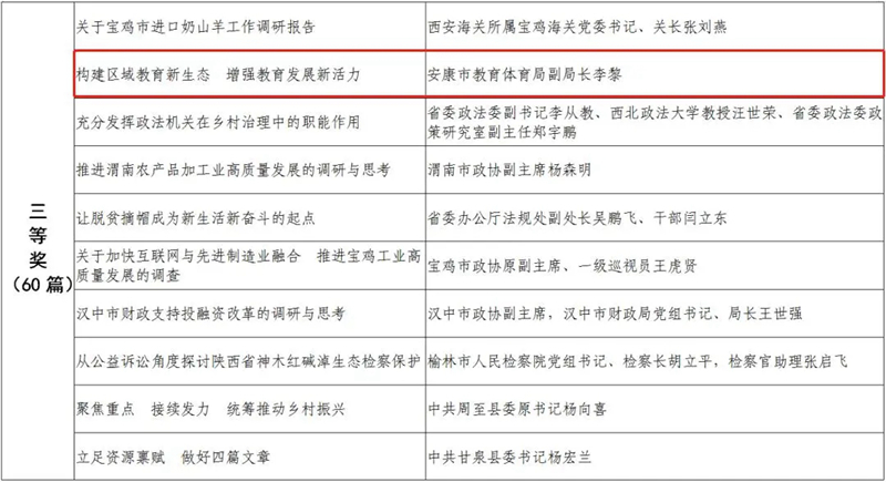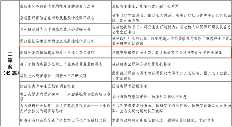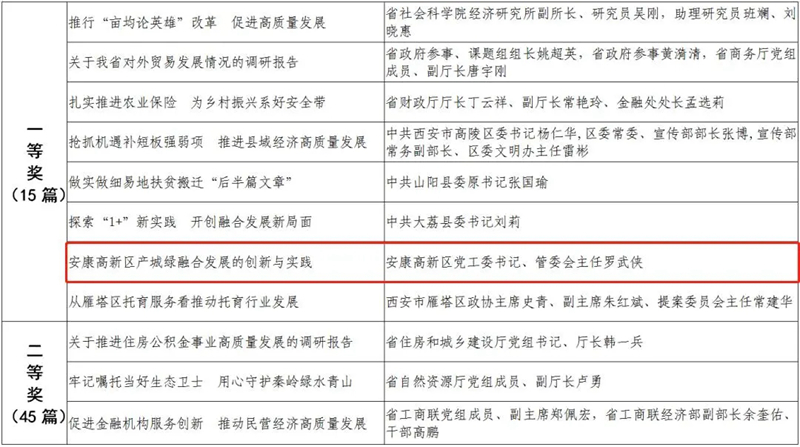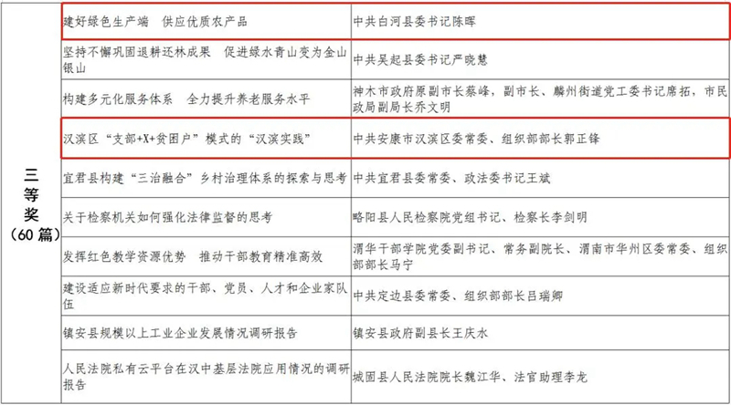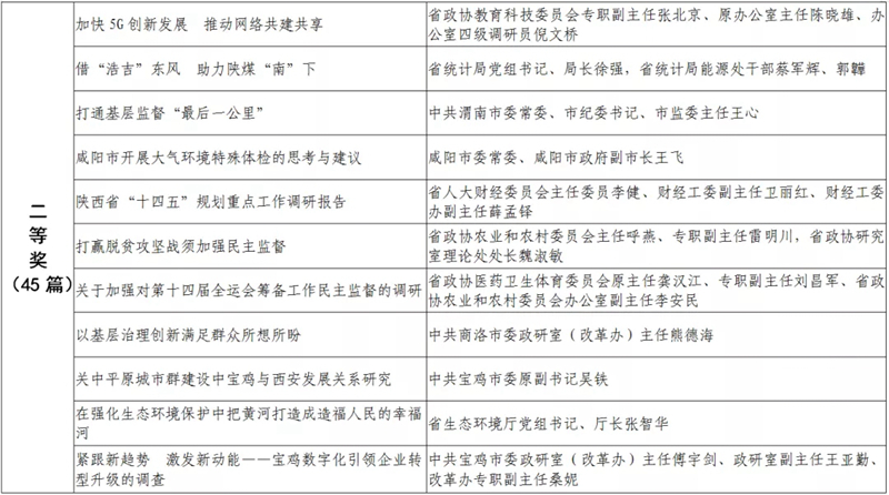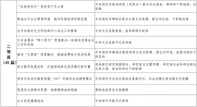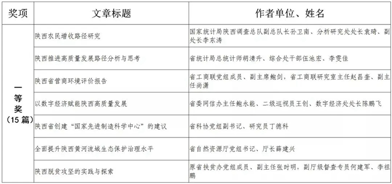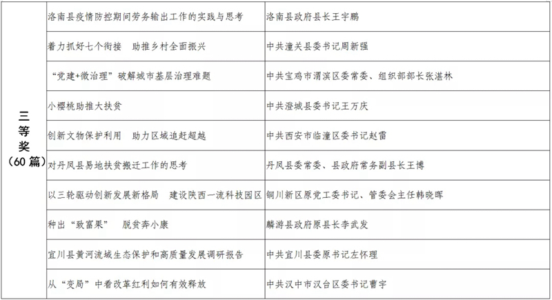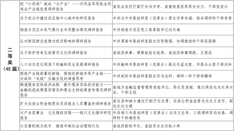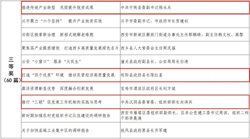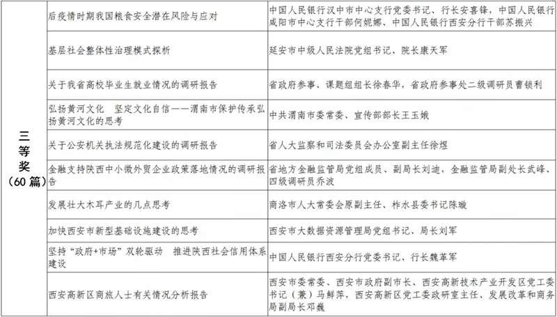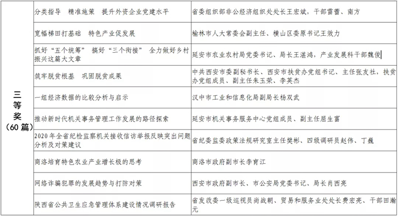 據(jù)悉,全省黨政領(lǐng)導(dǎo)干部?jī)?yōu)秀調(diào)研成果評(píng)選工作迄今已開(kāi)展了18年。本次評(píng)選活動(dòng)從全省市縣兩級(jí)和省級(jí)各部門(mén)上報(bào)的487篇縣處級(jí)以上黨政領(lǐng)導(dǎo)干部調(diào)研報(bào)告中,評(píng)出獲獎(jiǎng)優(yōu)秀調(diào)研成果120篇。其中,《陜西農(nóng)民增收路徑研究》等15篇獲一等獎(jiǎng),《關(guān)于推進(jìn)住房公積金事業(yè)高質(zhì)量發(fā)展的調(diào)研報(bào)告》等45篇獲二等獎(jiǎng),《后疫情時(shí)期我國(guó)糧食安全潛在風(fēng)險(xiǎn)與應(yīng)對(duì)》等60篇獲三等獎(jiǎng)。