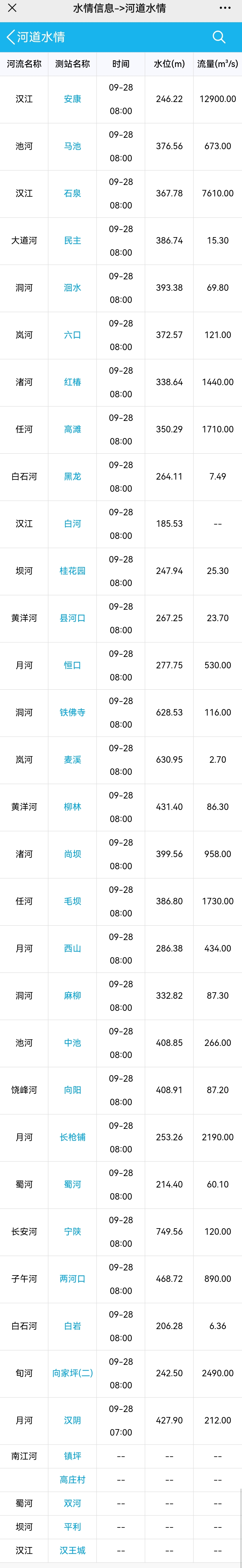 截至9月28日8時,漢江水位(安康測站)246.22m,流量12900.00m³/s。