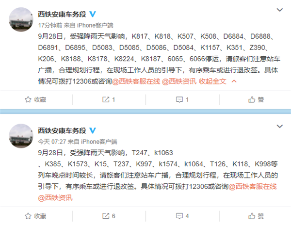 又訊:9月28日,受強降雨天氣影響,K817、K818、K507、K508、D6884、D6888、D6891、D6895、D5083、D5085、D5086、D5084、K1157、K351、Z390、K206、K8188、K8178、K8224、K8187、6065、6066停運。