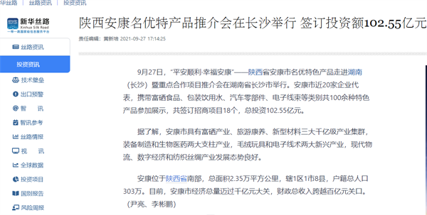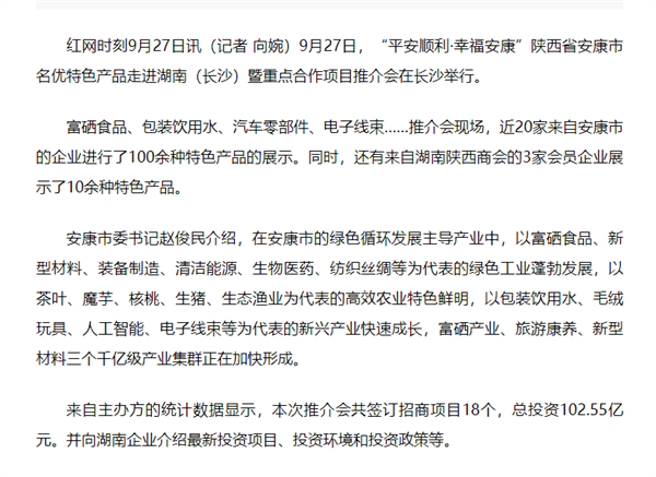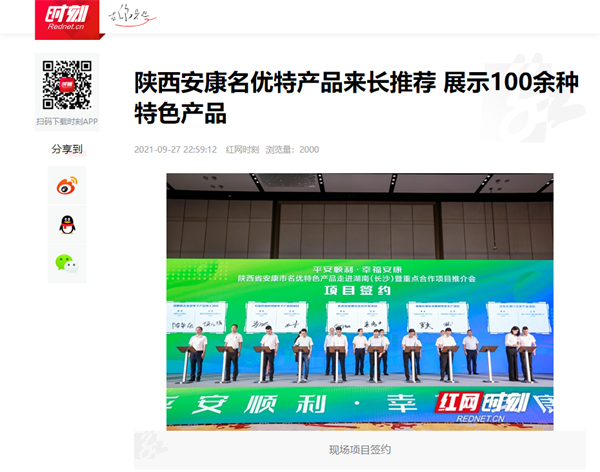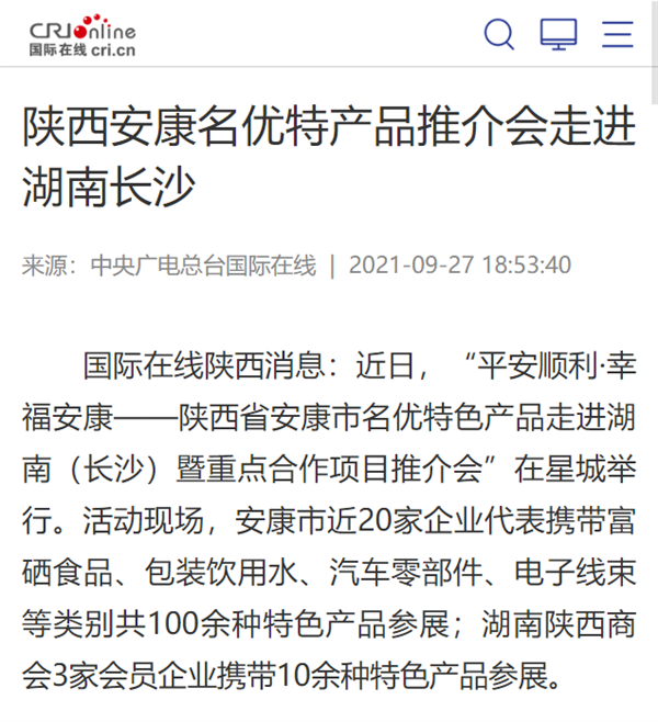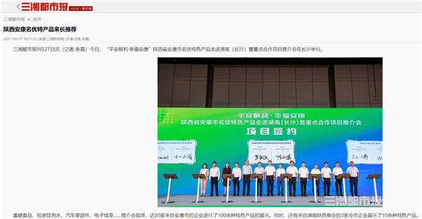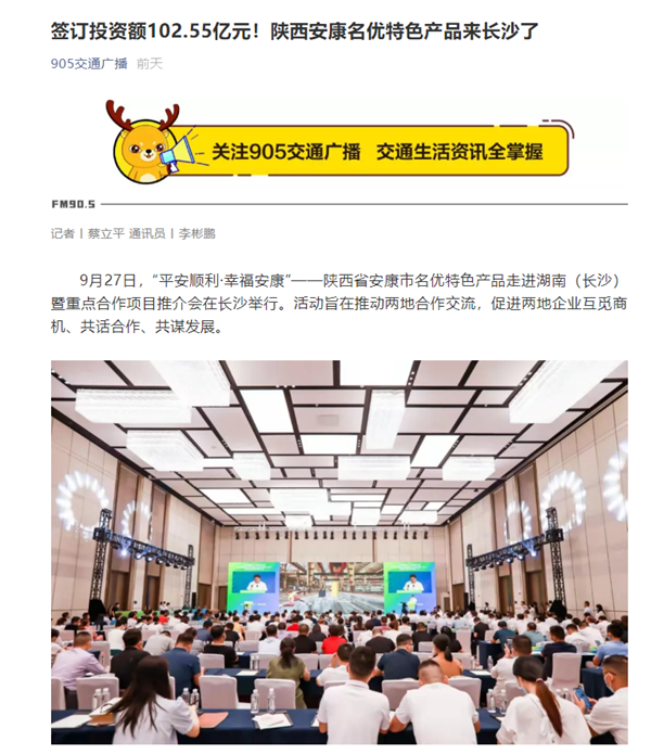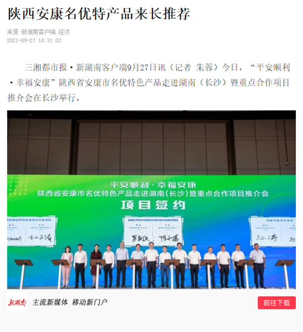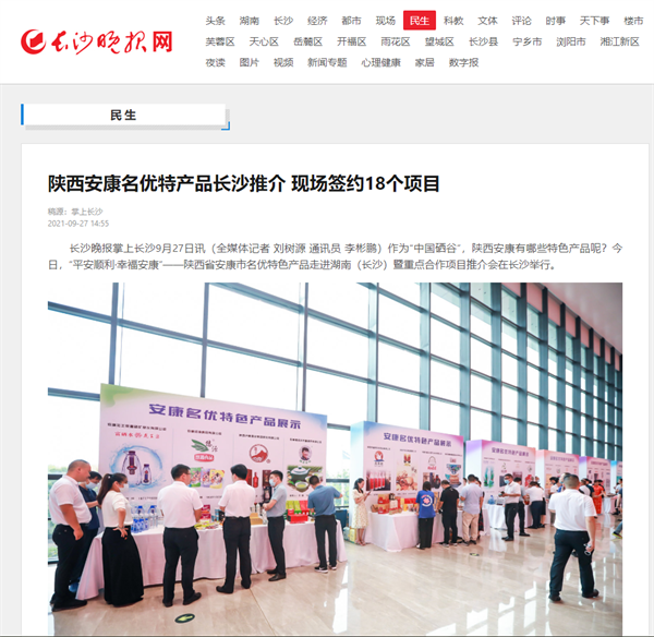 本網(wǎng)訊 9月27日,由中共安康市委、安康市人民政府,陜西省商務(wù)廳聯(lián)合主辦的“平安順利·幸福安康——陜西省安康市名優(yōu)特色產(chǎn)品走進(jìn)湖南(長沙)暨重點合作項目推介會”在長沙市成功舉辦。新華社、中國交通廣播、中國報道、湖南日報、長沙晚報、三湘都市報、國際在線、紅網(wǎng)等中省、長沙以及駐長多家媒體紛紛給予報道。媒體不僅高度贊揚兩地的合作成果,并對安康有了一個嶄新的評價和認(rèn)識。一起看看“老親戚”長沙眼中的“老鄰居”安康是什么樣!