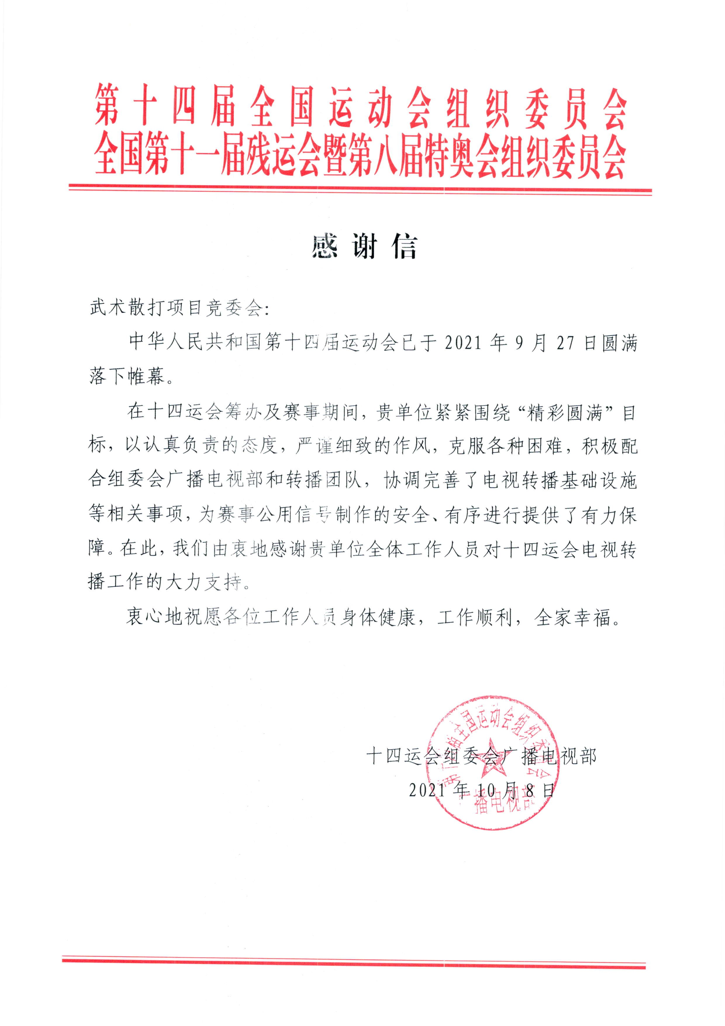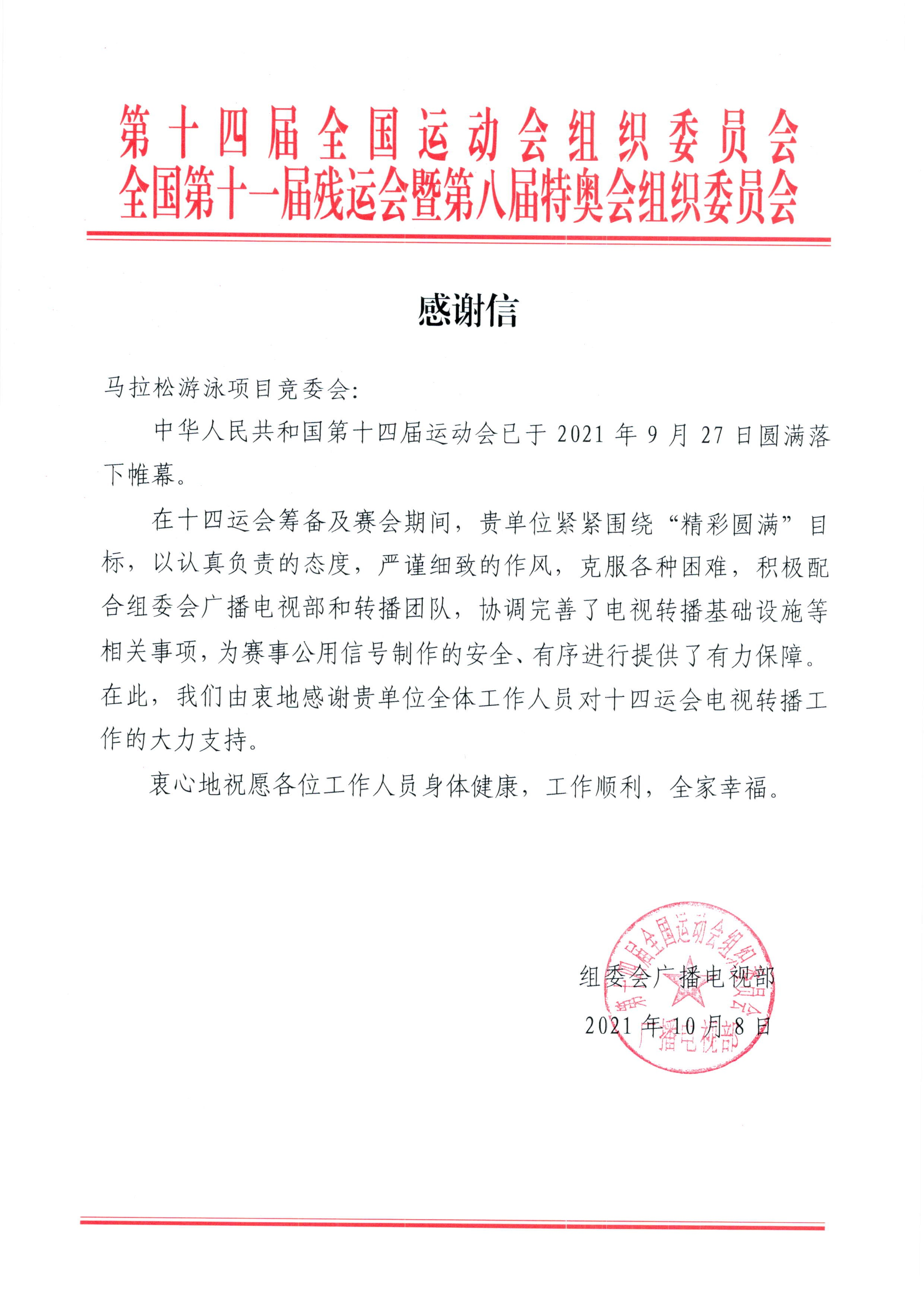 10月8日,十四運會組委會廣播電視部向我市馬拉松游泳項目競委會和武術(shù)散打項目競委會發(fā)來感謝信,對我市高質(zhì)量配合完成十四運會項目轉(zhuǎn)播等工作表示謝意。