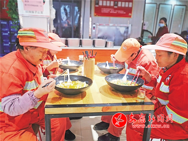 十幾年前,向美玉從湖南遠嫁至安康,幾年前加入了“城市美容師”的行列,負責(zé)清掃城區(qū)高井加油站附近的街面,平日起早貪黑,緊趕慢趕,區(qū)域內(nèi)衛(wèi)生才能保持干凈。如果中途回家吃個飯,就太耽誤時間了。得知天源飯莊為環(huán)衛(wèi)工人準備了熱氣騰騰的燴面片,她便和同事一起過來就餐。“冬天能吃一碗美味的燴面片,我們心里暖暖的,感謝老板和愛心人士對我們的關(guān)愛。”向美玉說。