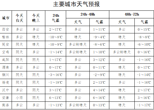 今天晚上:陜北、關(guān)中多云轉(zhuǎn)晴天,陜南陰天轉(zhuǎn)多云,南部局地有小雨。日平均氣溫陜北黃河沿線、關(guān)中中東部下降4℃左右。