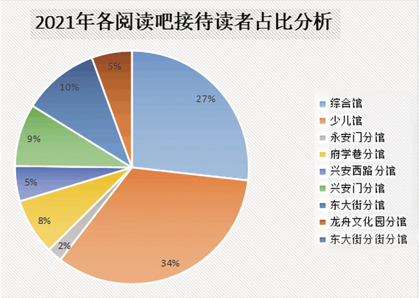 2021年,市圖書館(含各閱讀吧)共接待讀者437169人次,日均接待讀者達(dá)到1197人次。閱讀吧共計(jì)接待讀者172994人次,占全年接待讀者總?cè)藬?shù)的39%。數(shù)據(jù)表明,市圖書館正逐步成為市民閱讀、學(xué)習(xí)、交流、休閑的重要場所。安康閱讀吧在為讀者提供便捷閱讀的同時(shí),節(jié)約了時(shí)間成本,加快了書香安康的建設(shè)步伐。