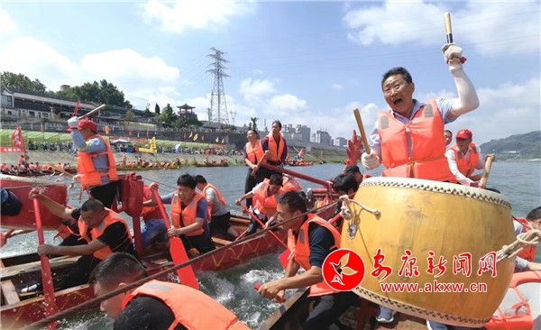 上午10時許,龍舟文化園禮炮轟鳴,數(shù)百健兒痛快地飲下“摔碗酒”,隨后依次登上自己隊伍的龍舟。紅色、黃色、紫色的龍舟整齊劃一地?吭诮叄堫^高昂,龍尾高翹,槳櫓浮動,旗幟飄揚。聞聲而來的群眾齊聚兩岸,駐足圍觀。總指揮一聲哨響,木槳齊動,龍舟似箭掠過無垠江面直逼江心,留下層層白浪;一艘艘或逆流勇進,或順流而下,或徑直橫渡,瞬間點燃觀眾激情,不時引得大家齊聲吶喊。號子聲、鑼鼓聲、吶喊聲、歡呼聲,此起彼伏,聲聲震天。隊員們跟隨著鼓點賣力地劃槳,舵手隨著龍舟行進的方向不停調(diào)整把舵,龍舟的速度不斷加快,再快,更快。
