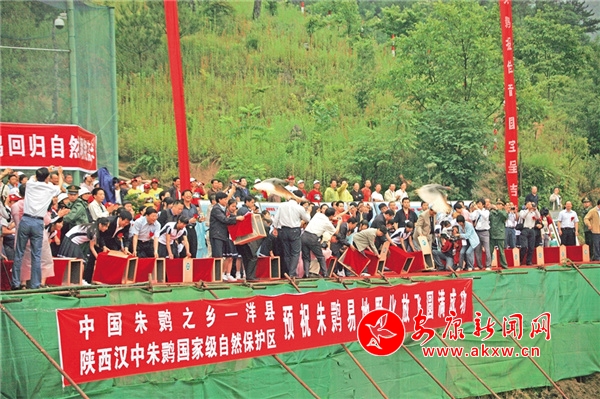 2007年5月31日,中國陜西朱鹮野化放飛儀式正式在寧陜縣寨溝村舉行。中省領(lǐng)導(dǎo)出席了放飛儀式,并打開鳥籠,一起放飛了20只朱鹮,隨后,放飛基地的技術(shù)人員、寧陜縣的群眾代表和學(xué)生代表又放飛6只。隨著放飛的朱鹮翱翔藍(lán)天,標(biāo)志著朱鹮保護(hù)由單純的人工搶救開始轉(zhuǎn)向回歸自然的新階段,朱鹮搶救保護(hù)的歷史掀開了新的一頁。