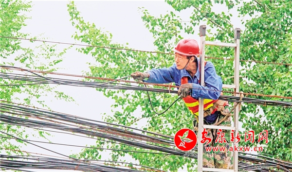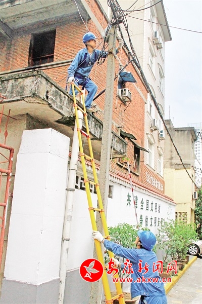 與此同時,不遠處的公路局家屬院內(nèi),國網(wǎng)漢濱分公司的工作人員也正在隔離區(qū)域內(nèi)進行空中作業(yè)。盡管汗水浸濕了厚重的牛仔工裝,但為了盡量縮短施工時間,現(xiàn)場的工作人員仍以最快的速度甄別、剪除廢線,梳理捆扎。不一會兒,一小片雜亂線纜就變得橫平豎直、高低一致、規(guī)范有序。