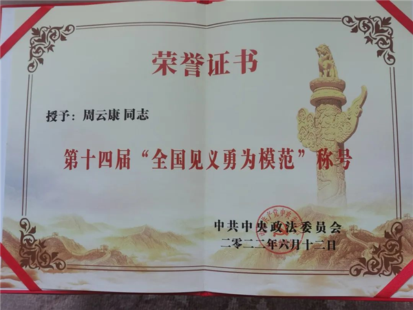 獲此殊榮,周云康感到十分激動,他說:“在人民群眾有生命危險(xiǎn)時(shí),見義勇為,挺身而出,是自己的本能,很榮幸能受到國家表彰,國家和人民給了自己這么高的榮譽(yù),作為一名志愿者,今后將不忘初心,繼續(xù)傳遞見義勇為的正能量,帶動更多的人,積極主動投身見義勇為的行列之中,為平安安康做出貢獻(xiàn)。”