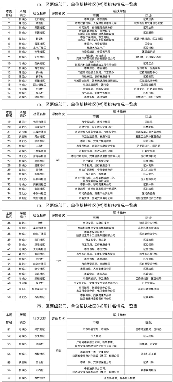 附件:市、區(qū)兩級(jí)部門(mén)、單位幫扶社區(qū)(村)周排名情況一覽表