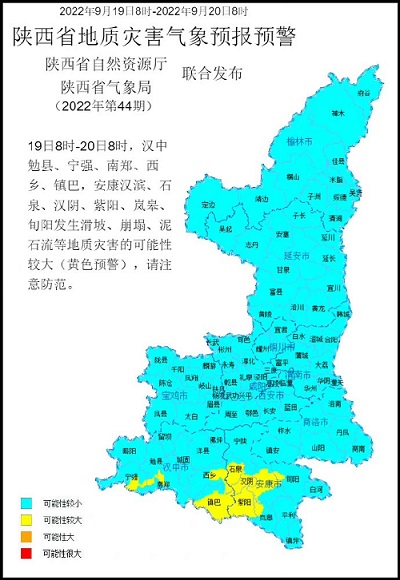 陜西省自然資源廳與陜西省氣象局聯(lián)合發(fā)布地質(zhì)災(zāi)害氣象預(yù)報(bào)預(yù)警:預(yù)計(jì)2022年9月19日8時(shí)至2022年9月20日8時(shí),漢中勉縣、寧強(qiáng)、南鄭、西鄉(xiāng)、鎮(zhèn)巴,安康漢濱、石泉、漢陰、紫陽、嵐皋、旬陽發(fā)生滑坡、崩塌、泥石流等地質(zhì)災(zāi)害的可能性較大(黃色預(yù)警),請(qǐng)注意防范。